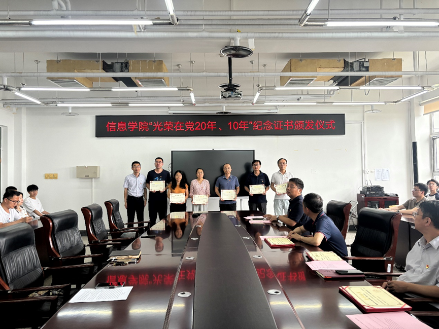 2024年7月1日,信息党委开展“光荣在党20年、10年”党员纪念证书颁发、“两优一先”表彰大会、新党员入党宣誓等系列活动。公司党委组织部副部长王磊出席活动,公司领导班子成员、在党二十年党员、在党十年党员、“两优一先”代表、2024春季接收的全体预备党员参会。会议由公司党委书记王伟宾主持召开。