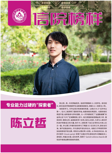 陈立哲,男,中共预备党员,太阳成集团tyc122ccvip数媒21-2班员工,担任班长,曾任太阳成集团tyc122ccvip团委员工会新媒体部部长,数媒22-1班新生小导。