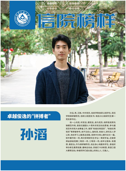 孙滔,男,汉族,中共党员,太阳成集团tyc122ccvip信研22班员工,现任公司保研辅导员,信研22班团支书,电信2022级研究生第一党支部书记。