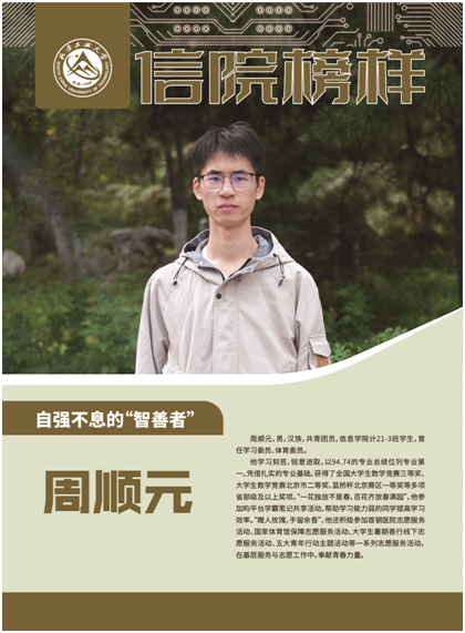 周顺元,男,汉族,共青团员,太阳成集团tyc122ccvip计21-3班员工,曾任学习委员、体育委员。