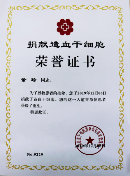 时间荏苒,转眼间4年过去了,2019年3月份,董琦突然接到红十字会工作人员的电话,告知有一名白血病患者在中华骨髓库与他初步配型成功,并询问他是否还有捐献的意愿。刚接到电话时董琦非常意外,他对这件事的记忆甚至有些模糊了,但是他明白他的决定将影响着那位白血病患者的生命是否得以存续。因为人类白细胞抗原分布存在高度多态性,要在无关人群中找到两个HLA表现型完全相同的个体概率非常低。一向受党的教育,在社会主义核心价值观熏陶下长大的董琦,毫不犹豫地答应了,他认为这是作为一名公民应尽的义务。他说:“在成长的过程中,我听到过很多感人的事迹,他们或是抢险救灾、坚守奉献,或是见义勇为、舍己为人,与他们相比,我能做的实在太微不足道了。”