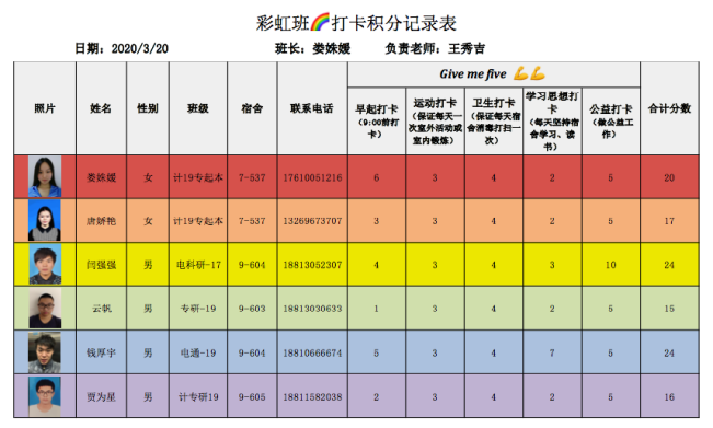 Five之“早起打卡”——“彩虹班”所有同学每天上午9:00前在班级群中进行打卡,并报告健康状况和所在位置,通过班级同学互相监督,养成良好的作息习惯,每天更加精力充沛的学习工作。