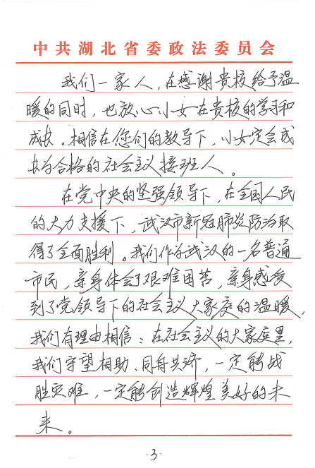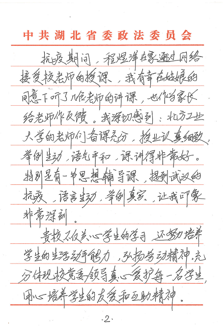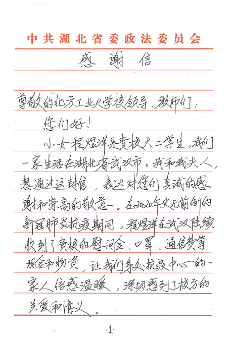 “小女程煜洋是贵校大二员工。我们一家生活在湖北省武汉市。我和我的夫人,想通过这封信,对您们表达真诚的感谢和崇高的敬意。在2020年史无前例的新冠肺炎抗疫期间,程煜洋陆续收到了贵校的慰问金、口罩、通信费等现金和物资,让我们身处抗疫中心的一家人倍感温暖,深切感到校方的关爱和情义……”。这是4月3日太阳成集团tyc122ccvip辅导员杨和家收到的一封来自通信18-3班程煜洋同学家长的感谢信,全文600余字,饱含了身处武汉抗疫中心的一家人对公司公司在疫情期间给予关心关爱的深切感激之情。