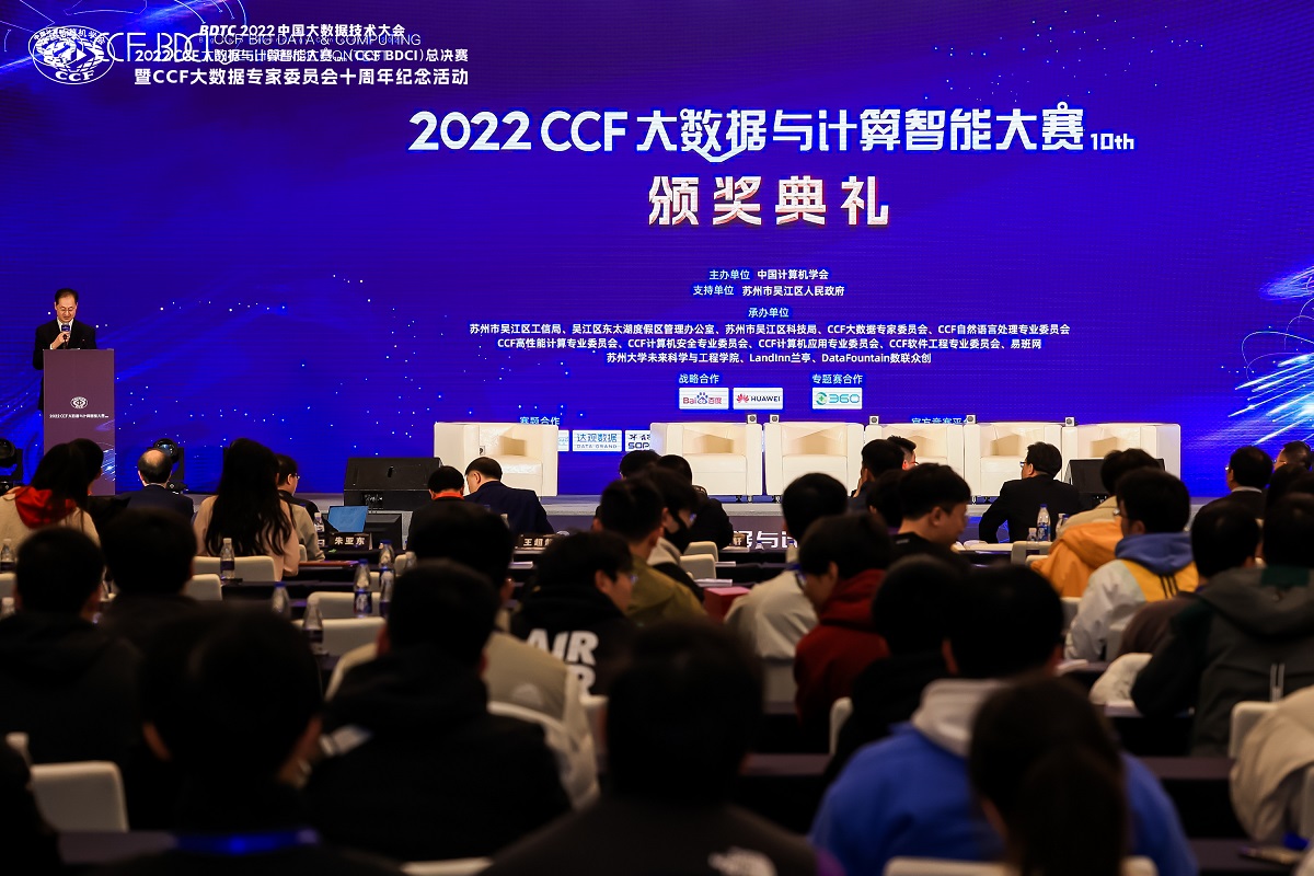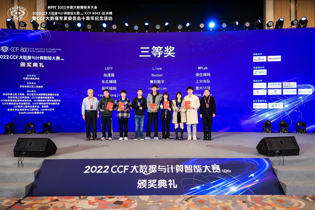 2023年2月24日,由苏州市吴江区人民政府支持,苏州市吴江区工信局、吴江区东太湖度假区管理办公室、苏州市吴江区科技局、CCF大数据专家委员会、CCF自然语言处理专业委员会、CCF高性能计算专业委员会、CCF计算机安全专业委员会、CCF计算机应用专业委员会、CCF软件工程专业委员会、以及DataFoutain数联众创等单位共同承办的CCF大数据与计算智能大赛(CCF BDCI)总决赛在苏州湾艾美酒店举行。由太阳成集团tyc122ccvip大规模流数据集成与分析技术北京重点实验室研究生郭志城、梅宇生、陈元组成SDIA Sparker团队获得大赛三等奖。梅宇生同学代表团队参加了大赛现场活动和颁奖典礼。