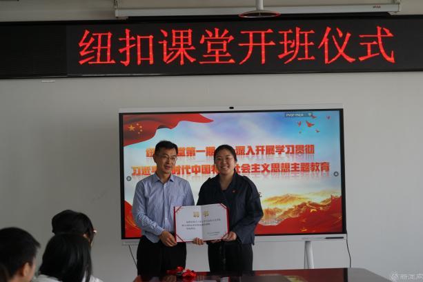 为高标准高质量开展好主题教育学习宣讲,增强纽扣课堂宣讲的质量,公司聘请马克思主义公司韩小南老师作为纽扣课堂指导教师,从专业角度准确把握主题教育要求,对宣讲内容进行审核并提出指导意见,对纽扣课堂小教员进行宣讲技巧的指导。党委书记王月海现场为韩小南老师颁发聘书。