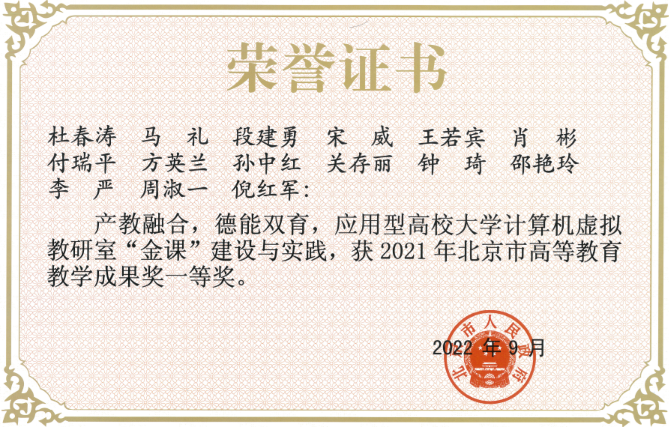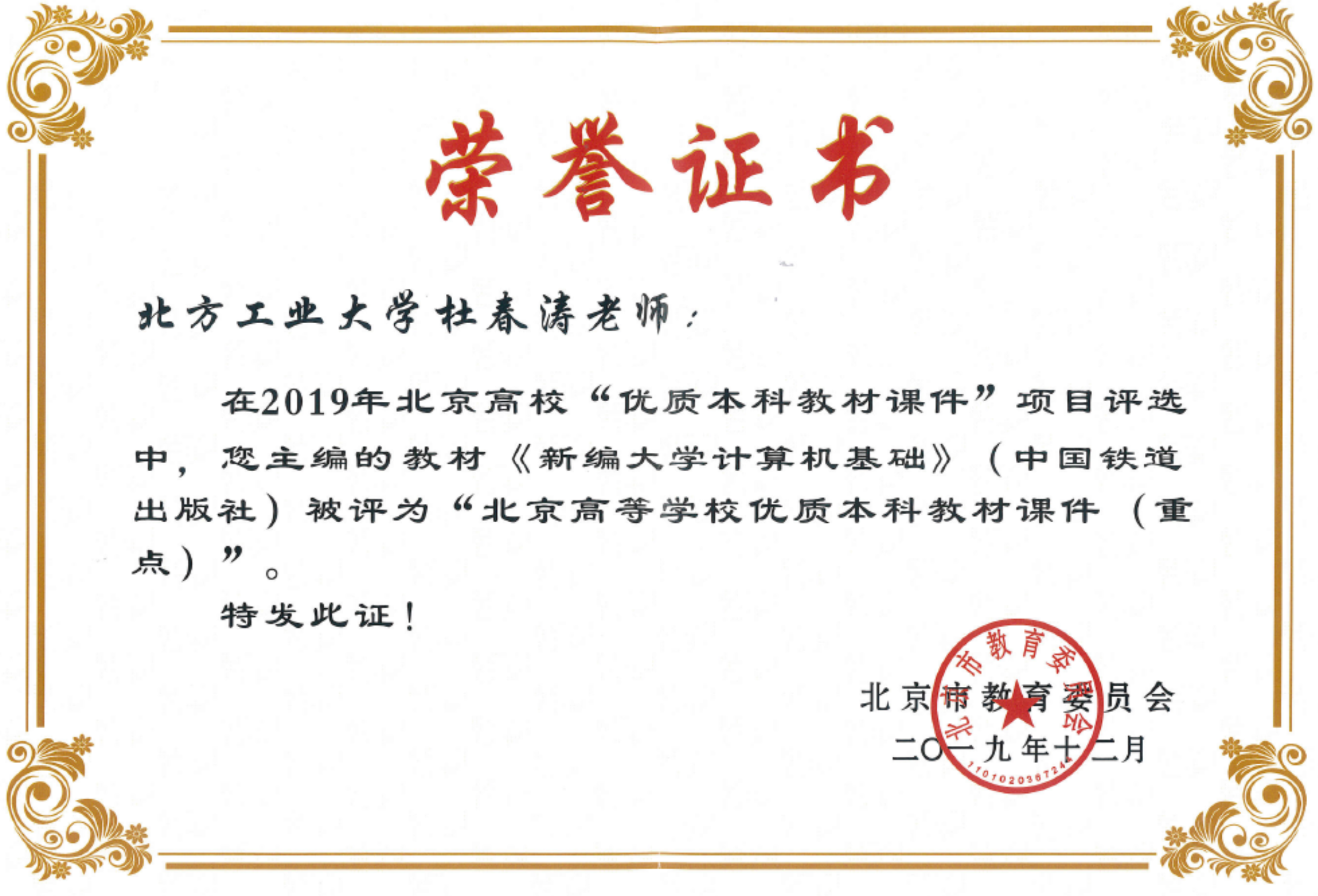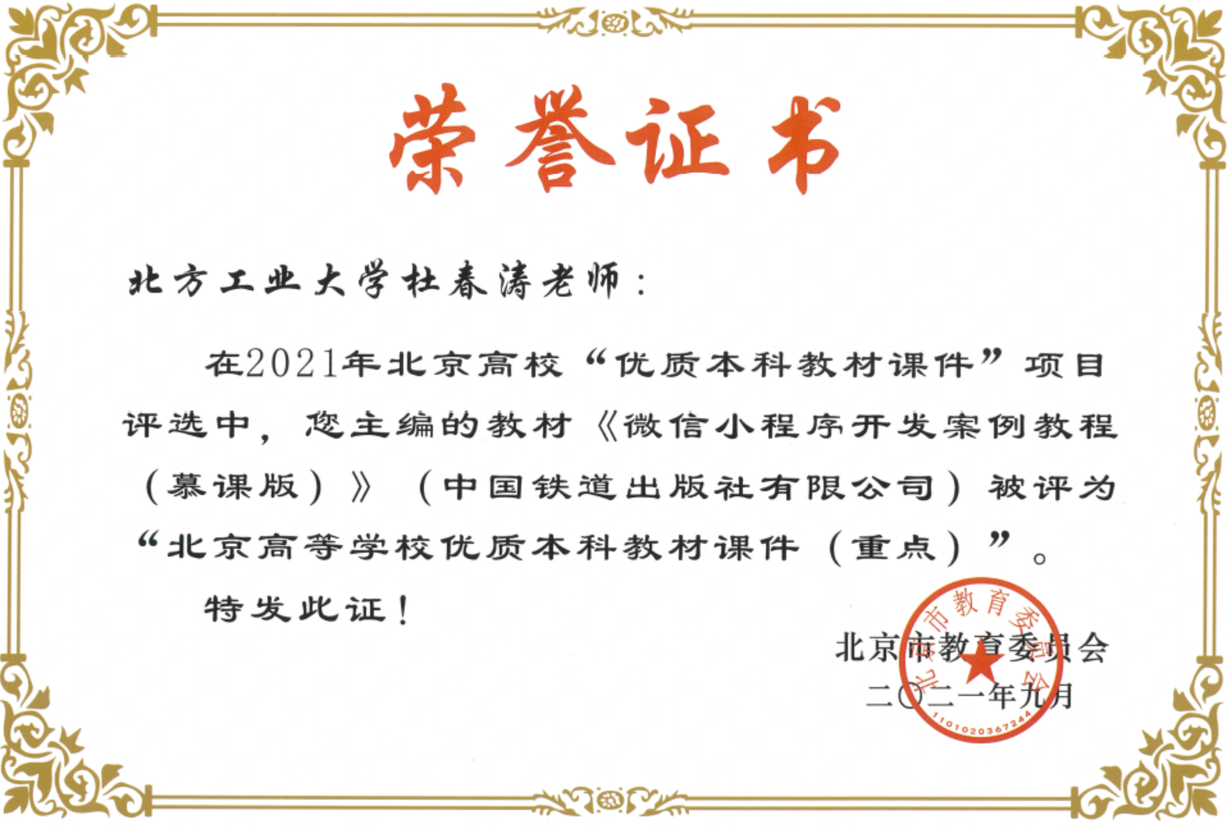 近年来,杜春涛教授主编的教材《新编大学计算机基础》和《微信小程序开发案例教程(慕课版)》,建设的MOOC《Angular Web前端框架开发基础》分别获2019年、2021年和2022年北京高校优质教材课件(重点),主讲的《Java程序设计》课程获北京高校优质本科教案,申报的教学成果《产教融合,德能双育,应用型高校大学计算机虚拟教研室“金课”建设与实践》获2021年北京高等公司产品成果一等奖。