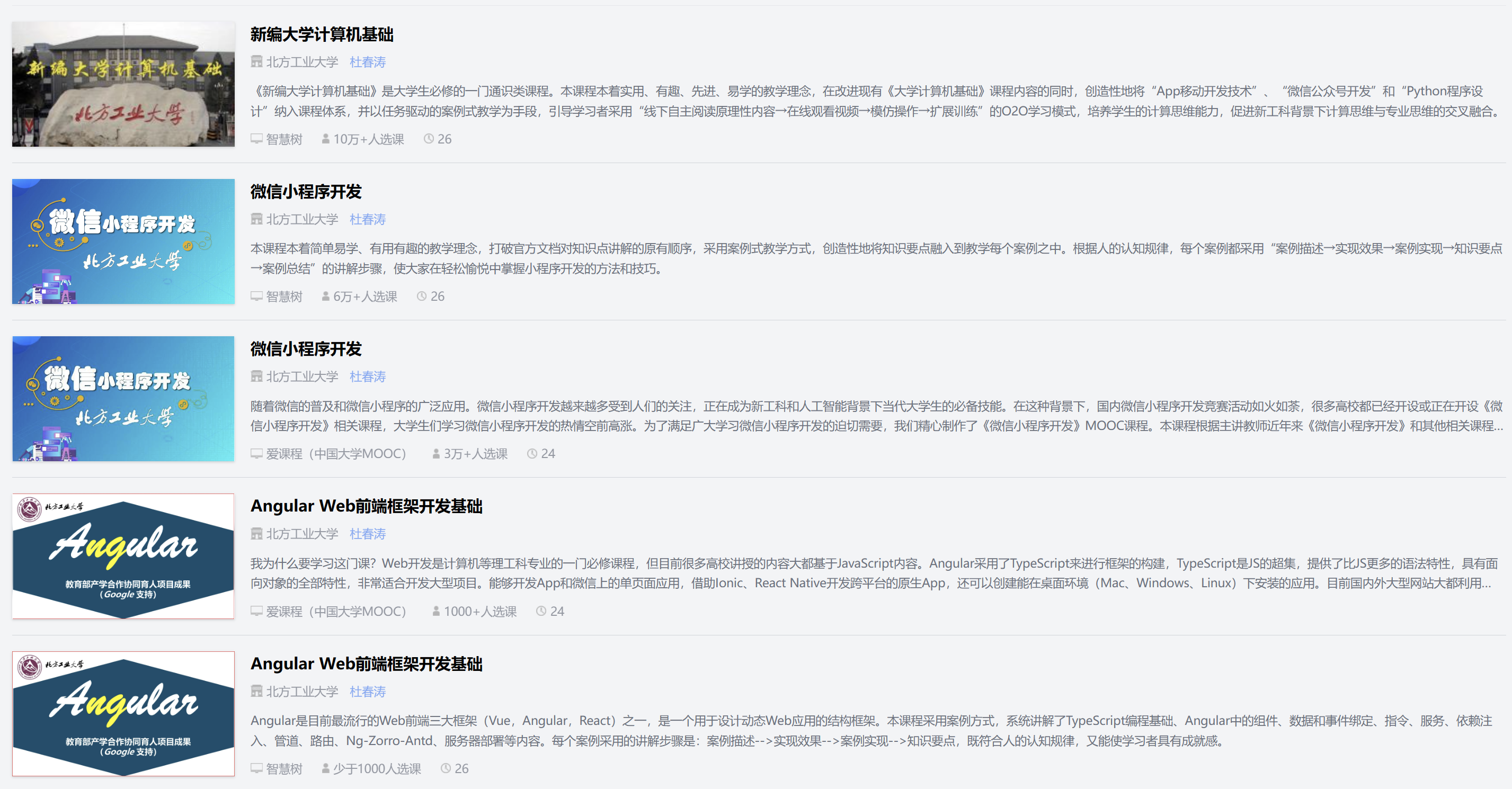 教育部副部长吴岩指出“坚持以员工为中心,以慕课为牵引,动员广大教师开展在线学习、翻转课堂、混合式教学等教学模式改革”,为推动信息技术与公司产品深度融合,杜春涛教授自2018年以来在教育部产学合作协同育人项目支持下,先后建设《新编大学计算机基础》(2018年)、《微信小程序开发》(2019年)、《Angular Web前端框架开发基础》(2021年)和《Dart语言》(2022年)等4门慕课,并以润物无声方式融入了大量思政元素以期实现育人的道术相济。其中3门上线国家高等教育智慧教育平台,累计选课人数超过30万。其中《新编大学计算机基础》获评中国高校计算机教育MOOC联盟2019年优秀课程目前选课人数超过18万,选课公司297所,累计互动154万多次。《微信小程序开发》选课人数超过10万,获评第二批国家一流线上课程。